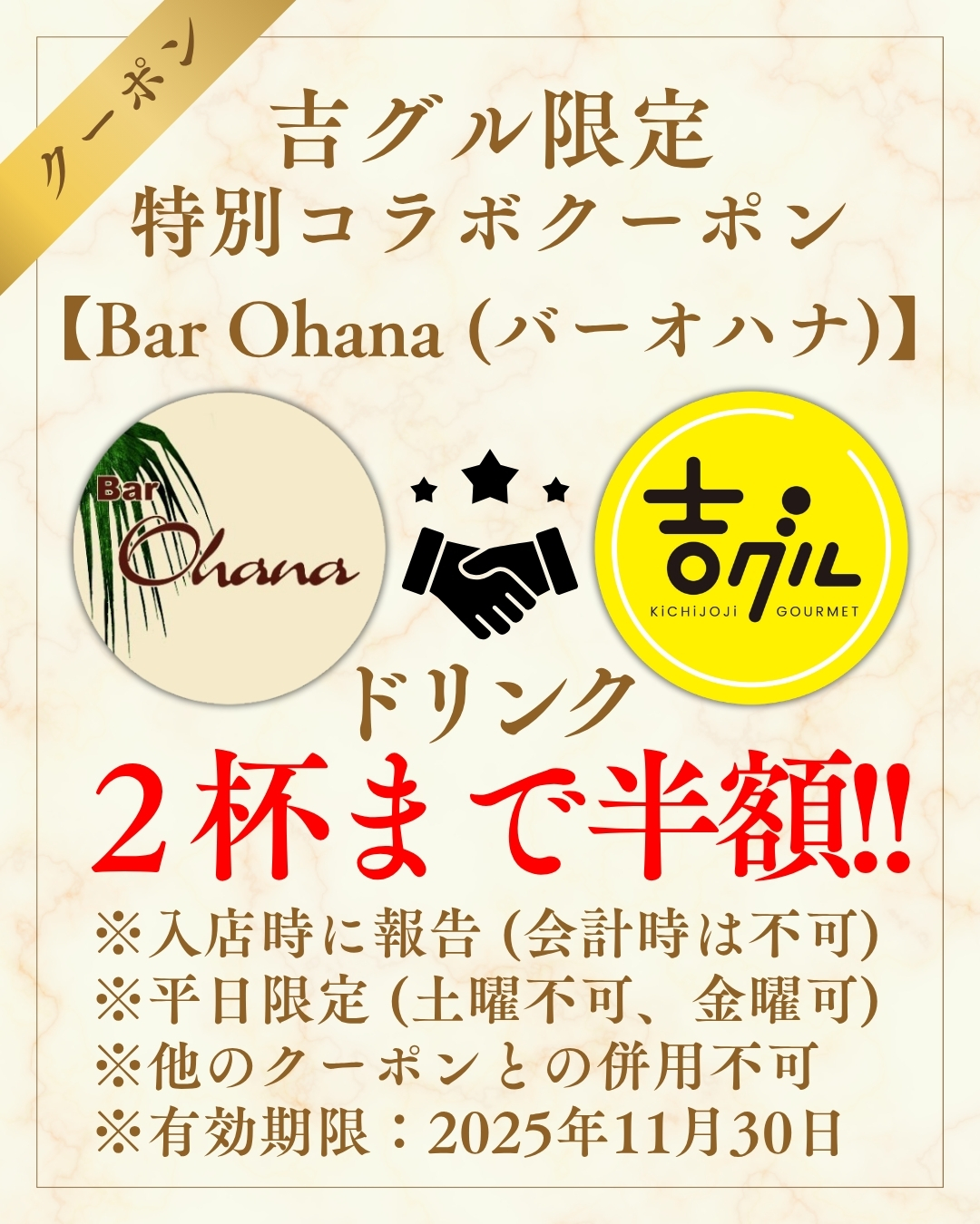 また、「バーオハナ」にて、ドリンクが2杯まで半額になるお得すぎる吉グル限定クーポンの許可を店主様からいただきましたので、是非ご活用ください!
