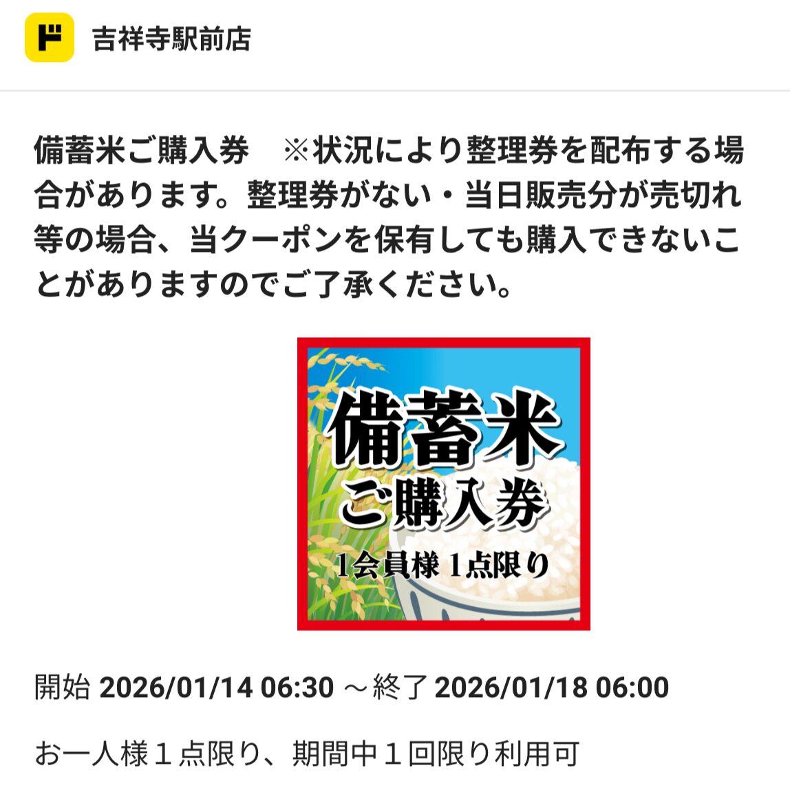 「ドン・キホーテ 吉祥寺駅前店」が、2026年1月14日(水)から備蓄米を販売開始しています🍚✨️