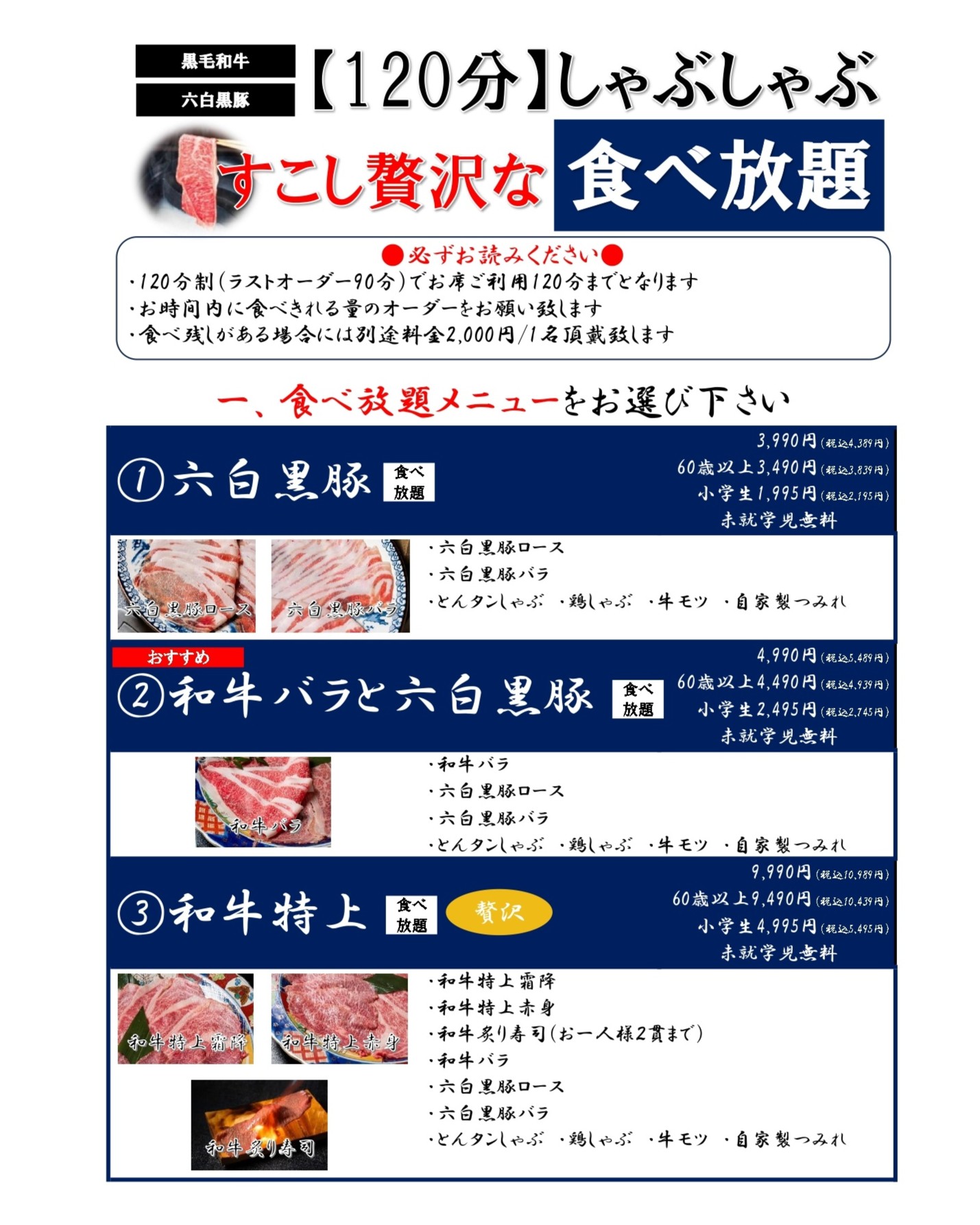 食べ放題コースは他に、和牛も食べ放題に追加された『和牛バラと六白黒豚しゃぶしゃぶ120分食べ放題』税別4,990円(税込5,489円)もありますので、さらに贅沢に和牛も食べたいかたにはオススメです🐃🐖🥩✨