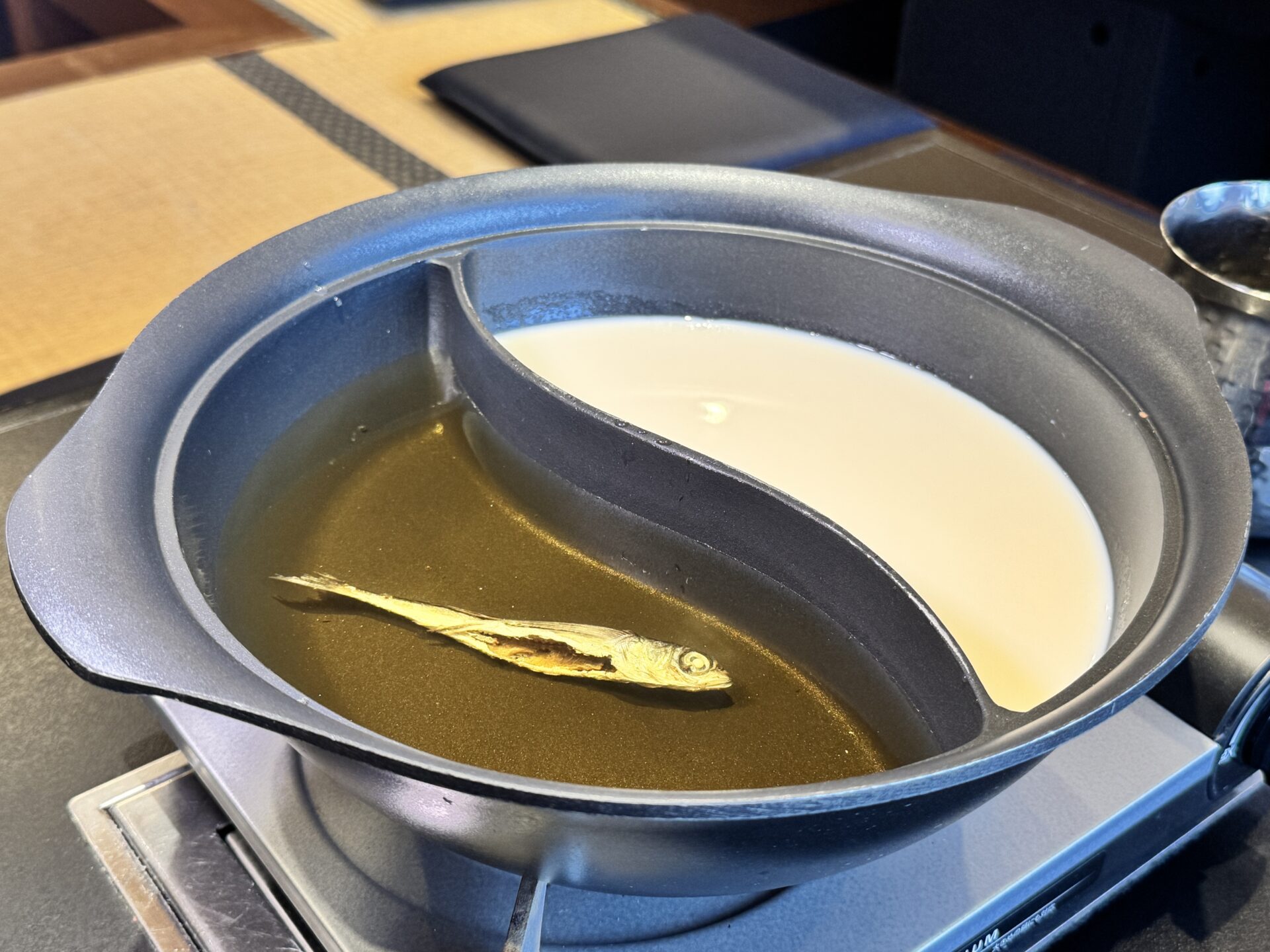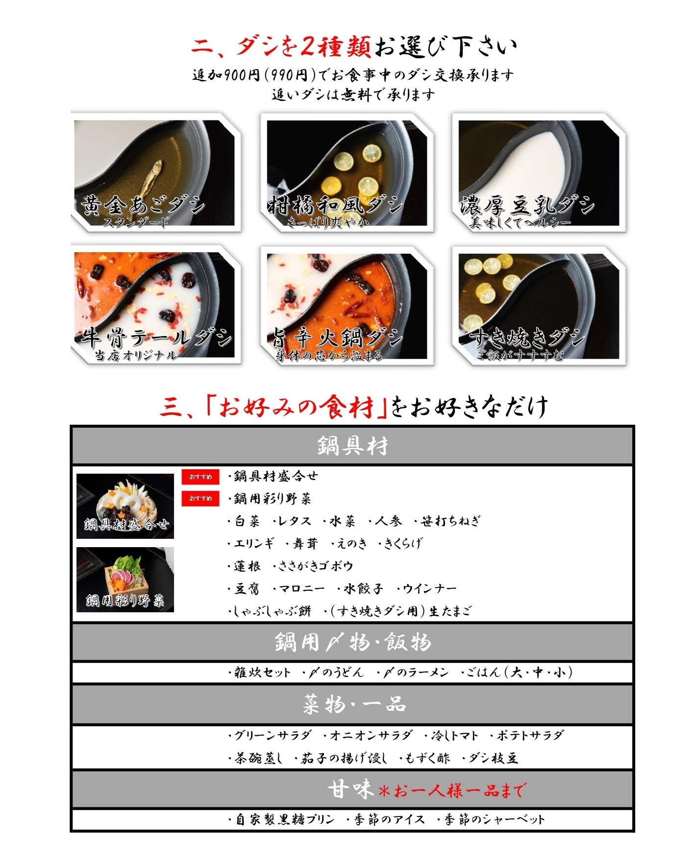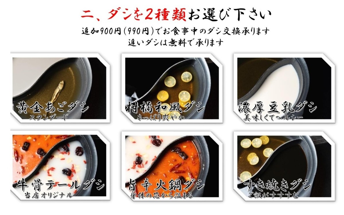 6種類のダシから2種類を選ぶことができます。追加900円(税込990円)で食事中のダシ交換ができます。追いダシは無料です。