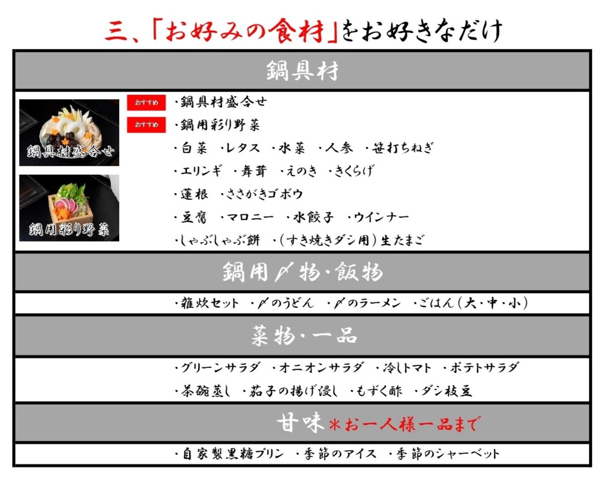『しゃぶしゃぶ食べ放題 六白黒豚』では下記の食材が食べ放題です!