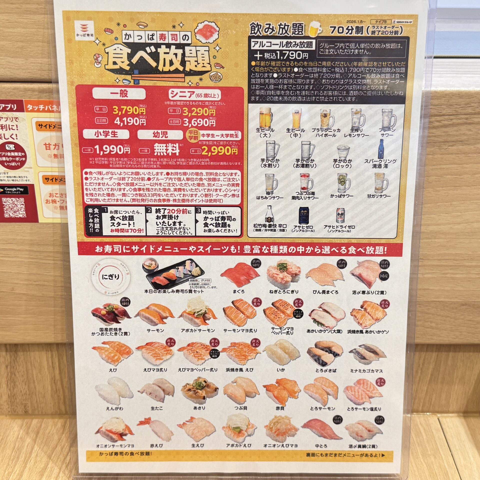 私達が行ってきた「吉祥寺駅北口コスモビル店」は、Bタイプの店舗なので、平日の一般利用で税込3,790円(土日祝日は4,190円)、シニア、学生などそれぞれ料金が異なり、未就学の幼児は条件付きで無料となります。約100種類のメニューを対象としていて、お寿司の他にもサイドメニューやデザートまでラインアップされています✨️
