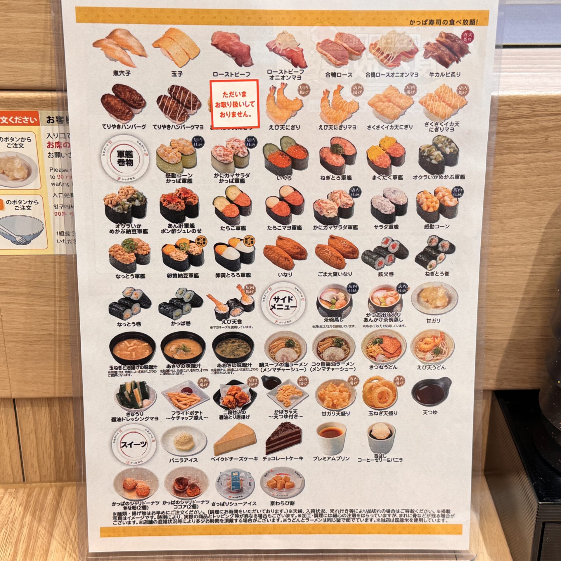 ▲かっぱ寿司食べ放題のメニュー