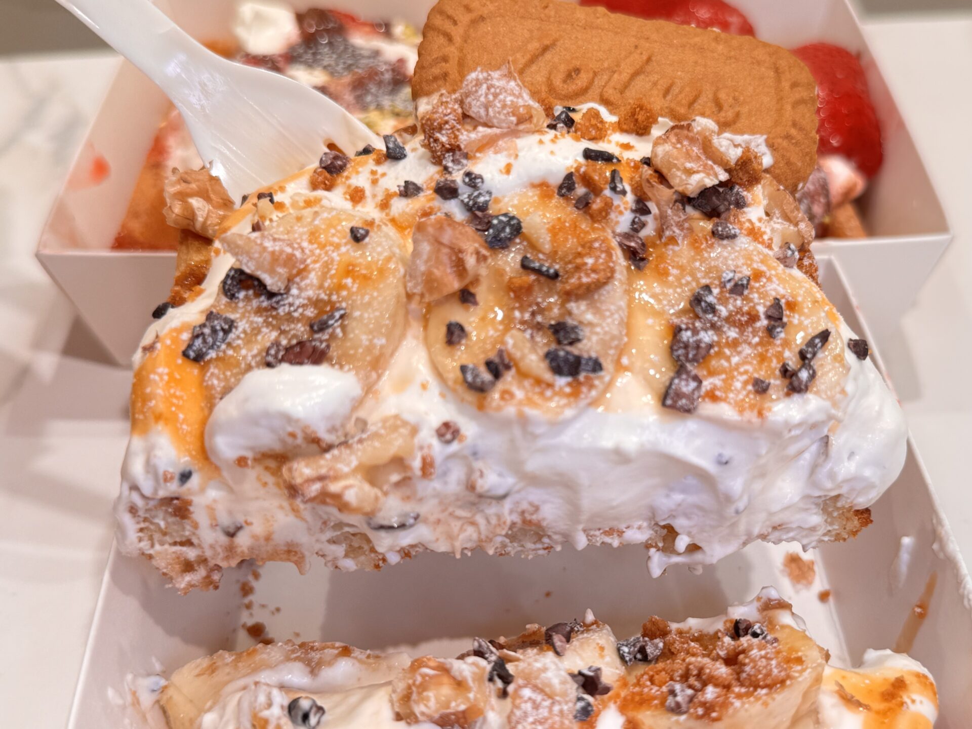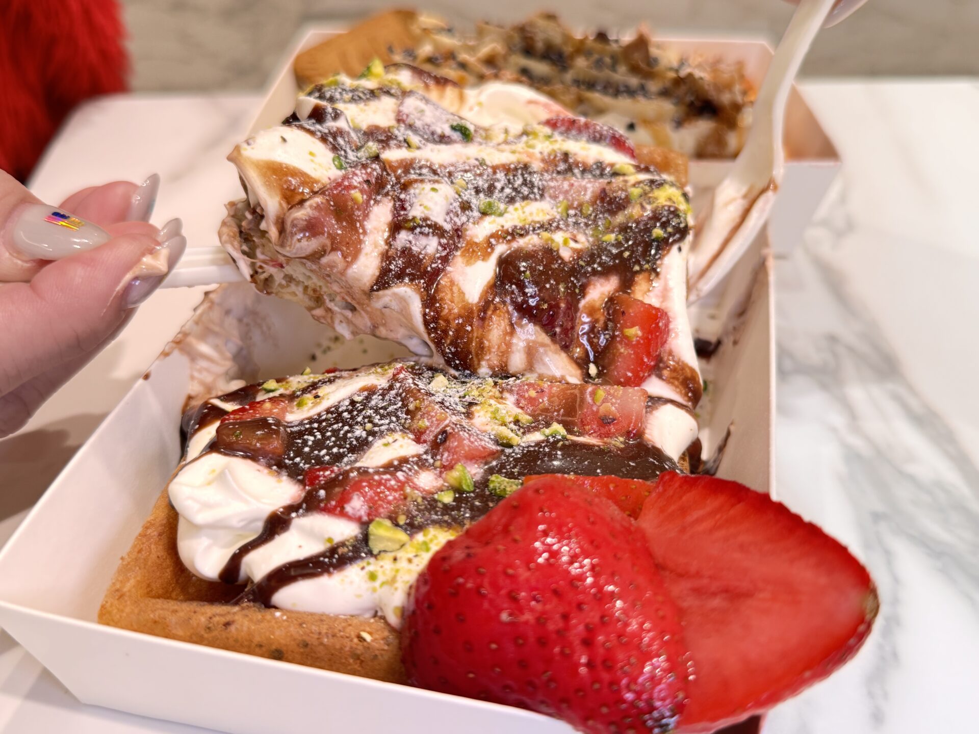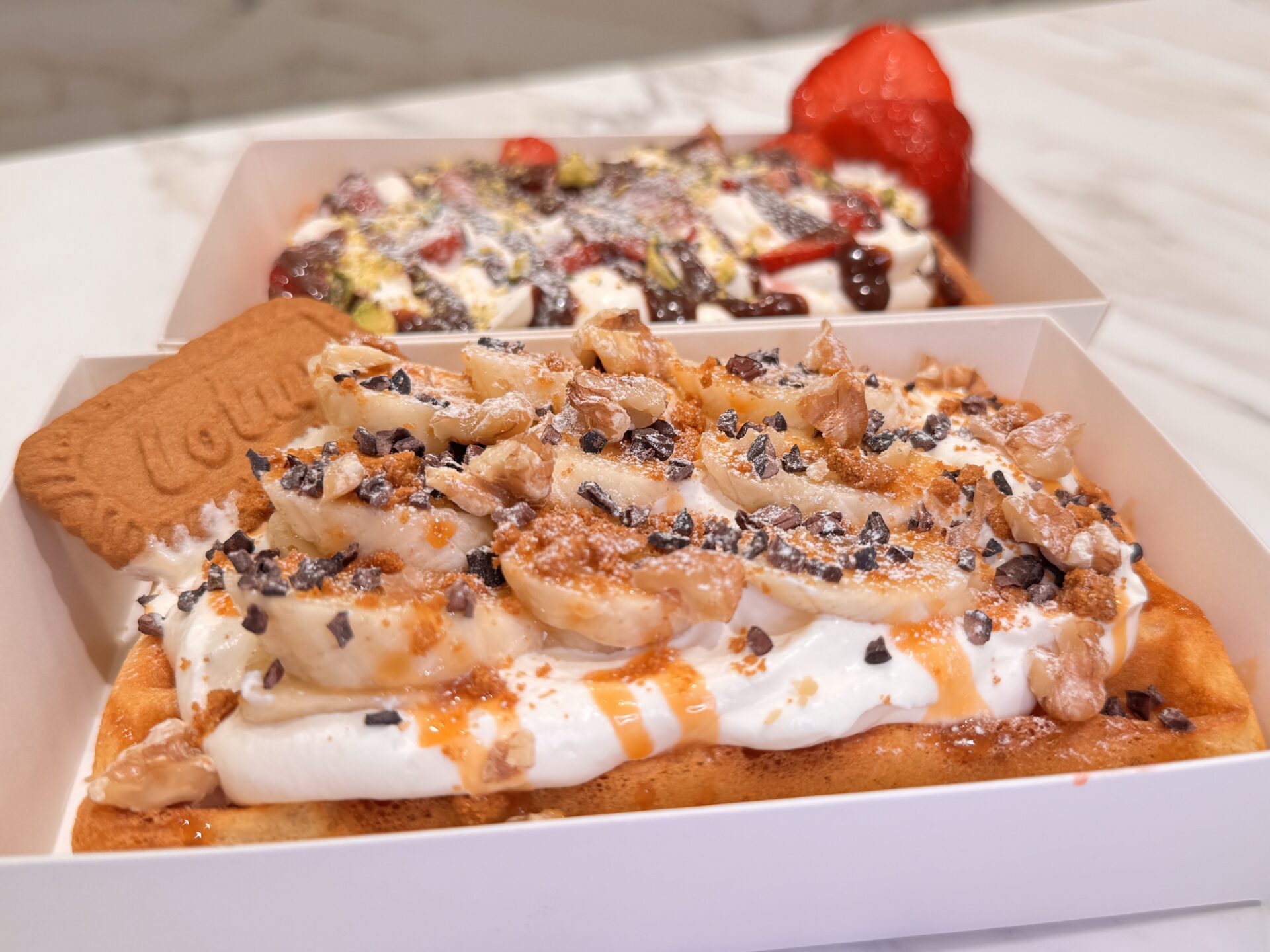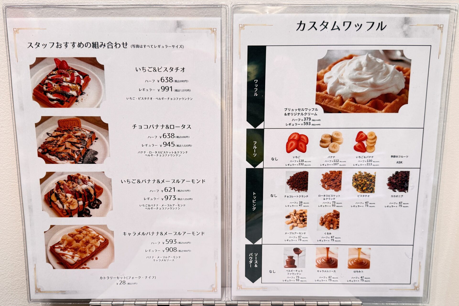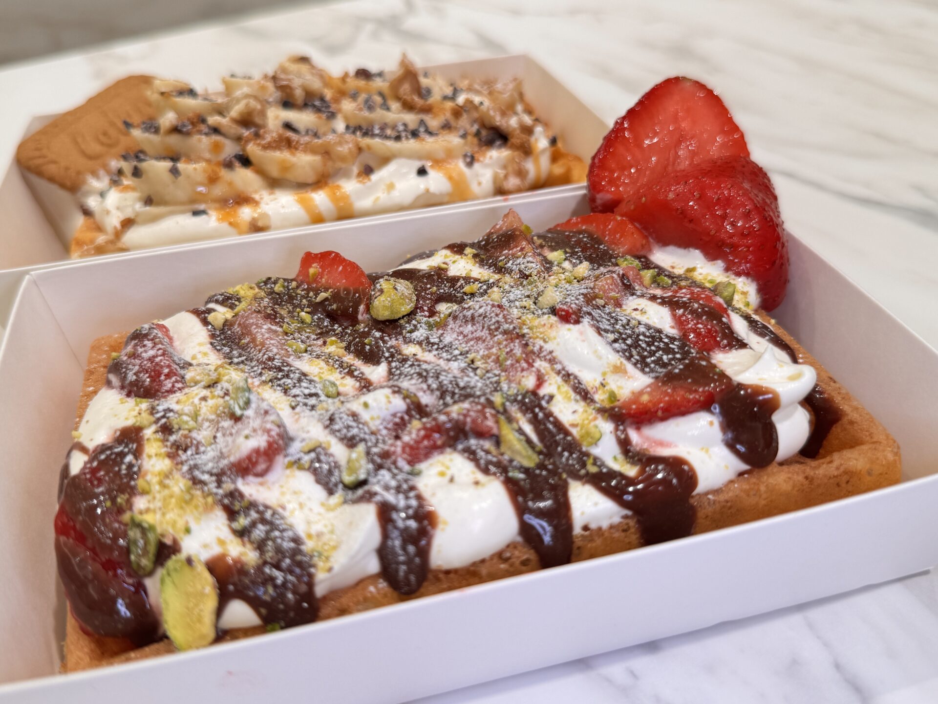 今回は、スタッフさんおすすめの組み合わせである「いちご&ピスタチオ」と、自分でカスタマイズをしたキャラメルバナナのワッフルを注文しました!
