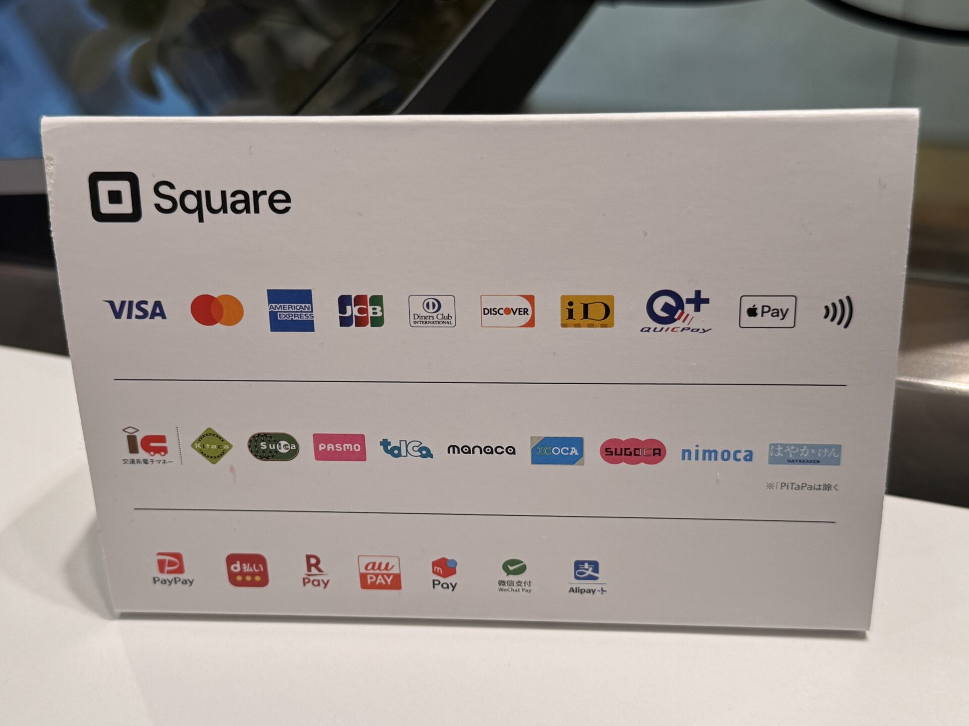 Squareを導入しているので、クレジットカードや電子決済などはひと通り使えます。