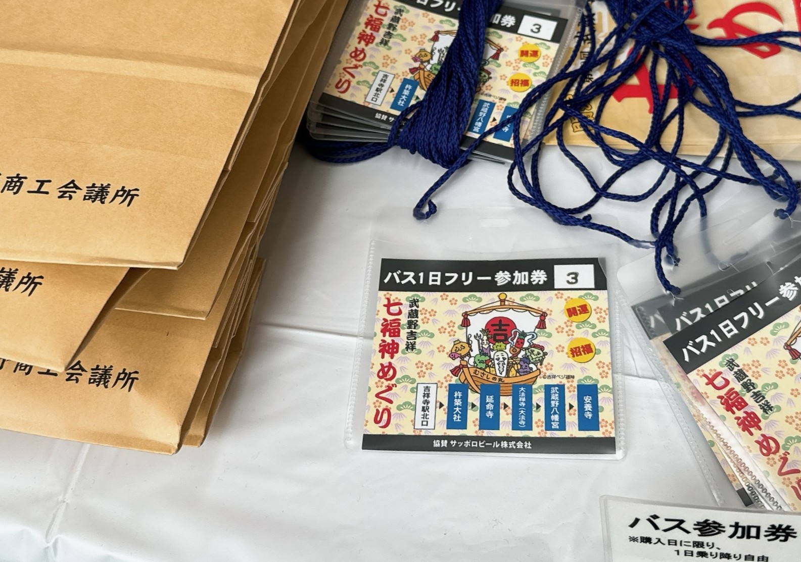 「七福神めぐり色紙セット」には、七福神の色紙、御朱印代、バス1日フリー参加券、吉祥ベジ福神クリアファイル、オリジナルのてぬぐいがセットになっています。