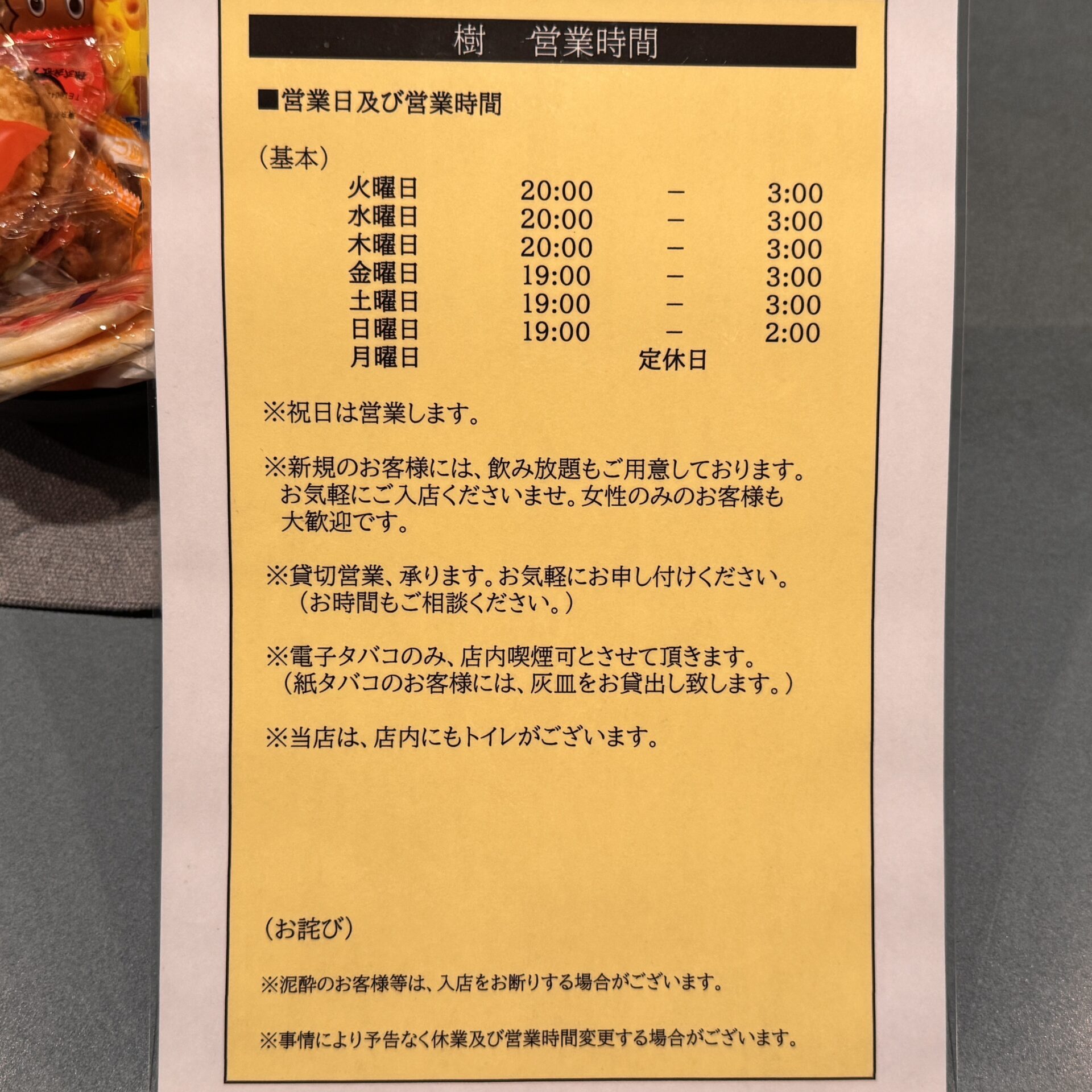 【MUSIC BAR 樹の営業時間や注意事項】