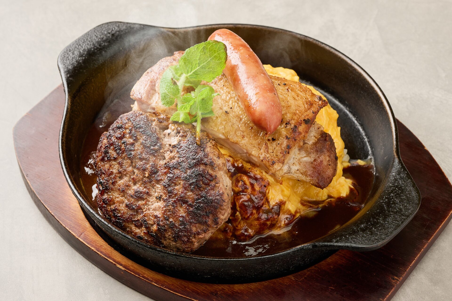 【肉盛りオムライス チキンステーキ&ソーセージ&ハンバーグ】