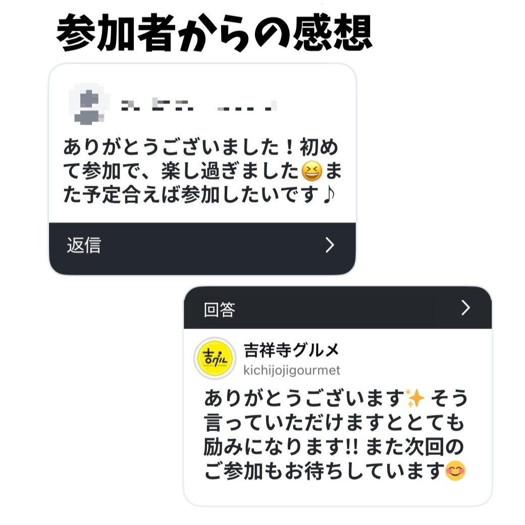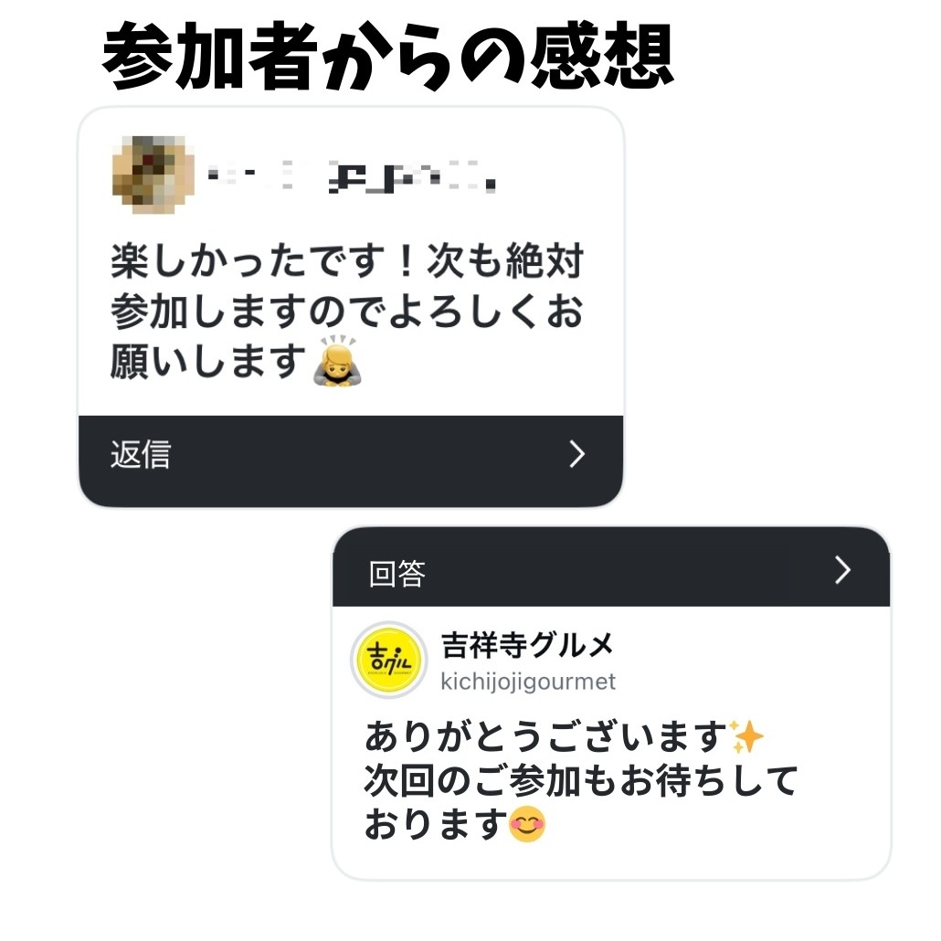 前回「第4回吉飲み」にご参加いただいた方々からの感想を、吉グルからの返答付きで紹介させていただきます。