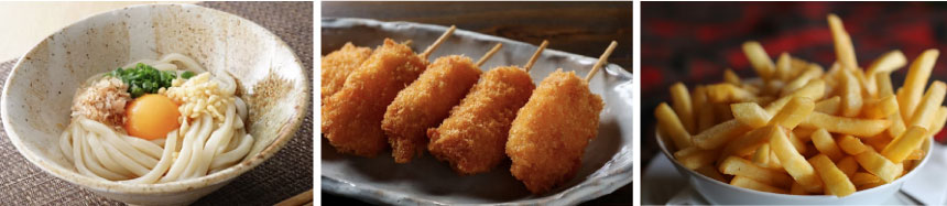 揚げたてサクサクの揚げ物や、出汁にこだわったおでん、お腹を満たすうどんなど、日本酒にあう美味しい食事やおつまみも用意しています。一般的なイメージの日本酒のおつまみはもちろん、日本酒を知っているからこそ「合う」フードを堪能できます!