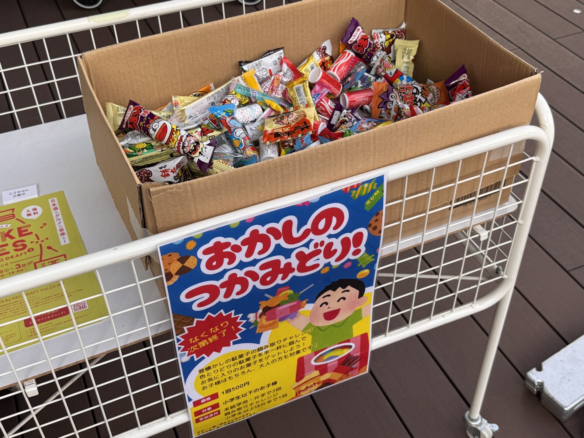 昔懐かしの駄菓子のつかみ取りチャレンジです。色とりどりの駄菓子を手いっぱいにつかんでお気に入りのお菓子をゲットできます。お子様はもちろん大人の方の参加も可能です。