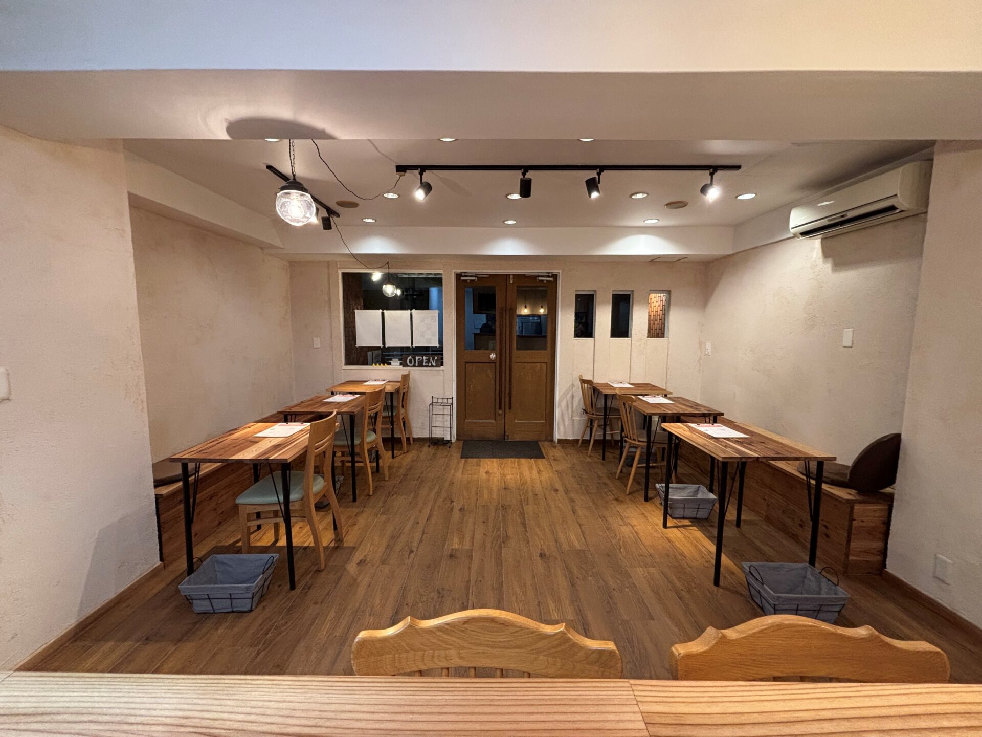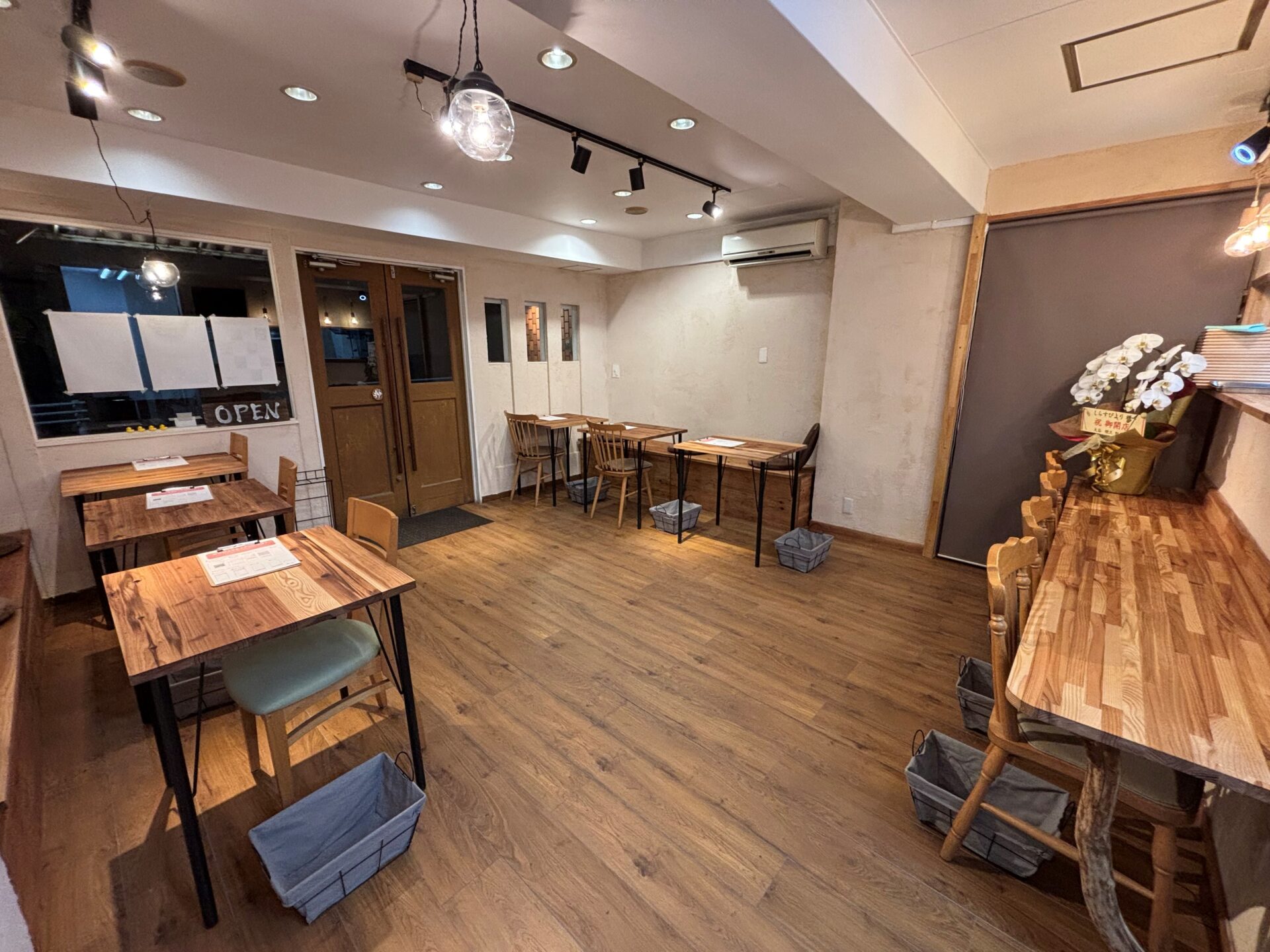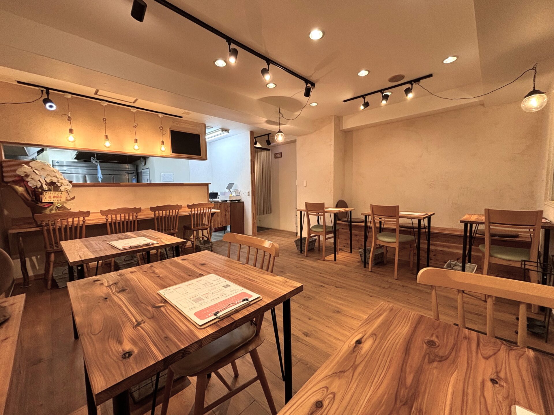 店内は、木目調の落ち着いた空間で、席数は、カウンター4席、テーブル12席、合計16席です。