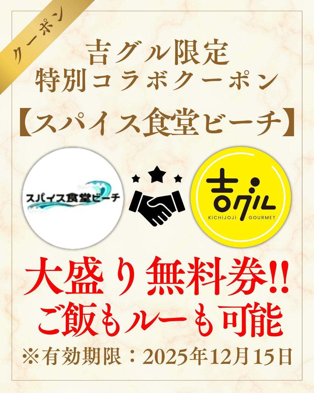 また、「スパイス食堂ビーチ」にて、大盛りが無料になるお得な吉グル限定クーポンの許可を店主様からいただきましたので、是非ご活用ください!