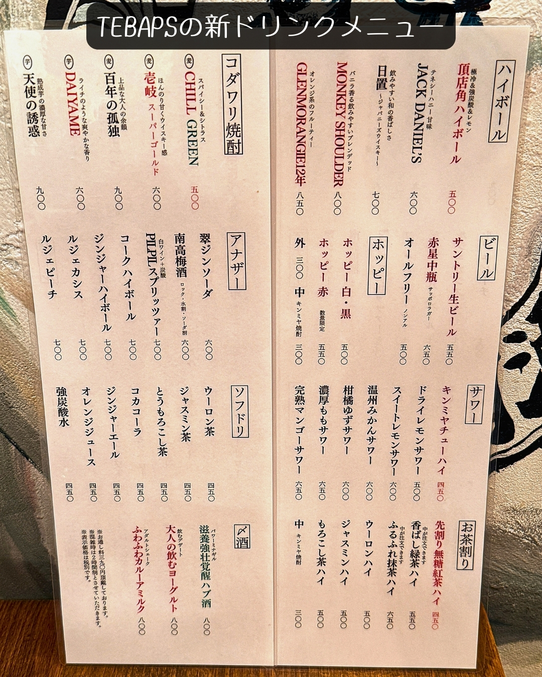 【TEBAPSのドリンクメニュー】